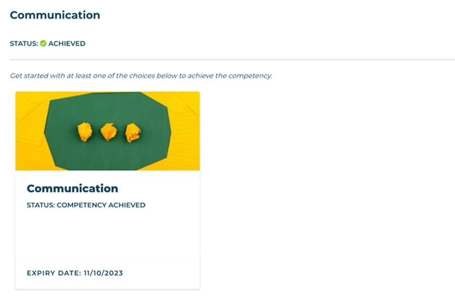 Sie können dann auch sehen, wie der/die Lernende eine Kompetenz erreichen kann, indem er/sie die Zertifikatsaktivität abschließt. Beachten Sie, dass auf dem Zertifikat auch ein Ablaufdatum angegeben ist, falls eine Rezertifizierung erforderlich sein sollte.