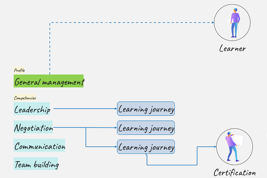Gehen wir ein wenig weiter ins Detail. Der/die Ausbildende erstellt eine Schulung rund um eine Kompetenz für ein bestimmtes Thema. Der/die Lernende führt dann eine Reihe von Aktionen oder Aktivitäten innerhalb dieser Schulung aus, um diese Kompetenzen zu erreichen. Auf diese Weise wird die Frage beantwortet, welche Fähigkeiten oder Kompetenzen erforderlich sind, um die nächste Stufe in ihrer Karriere oder ihrem Fachgebiet zu erreichen.