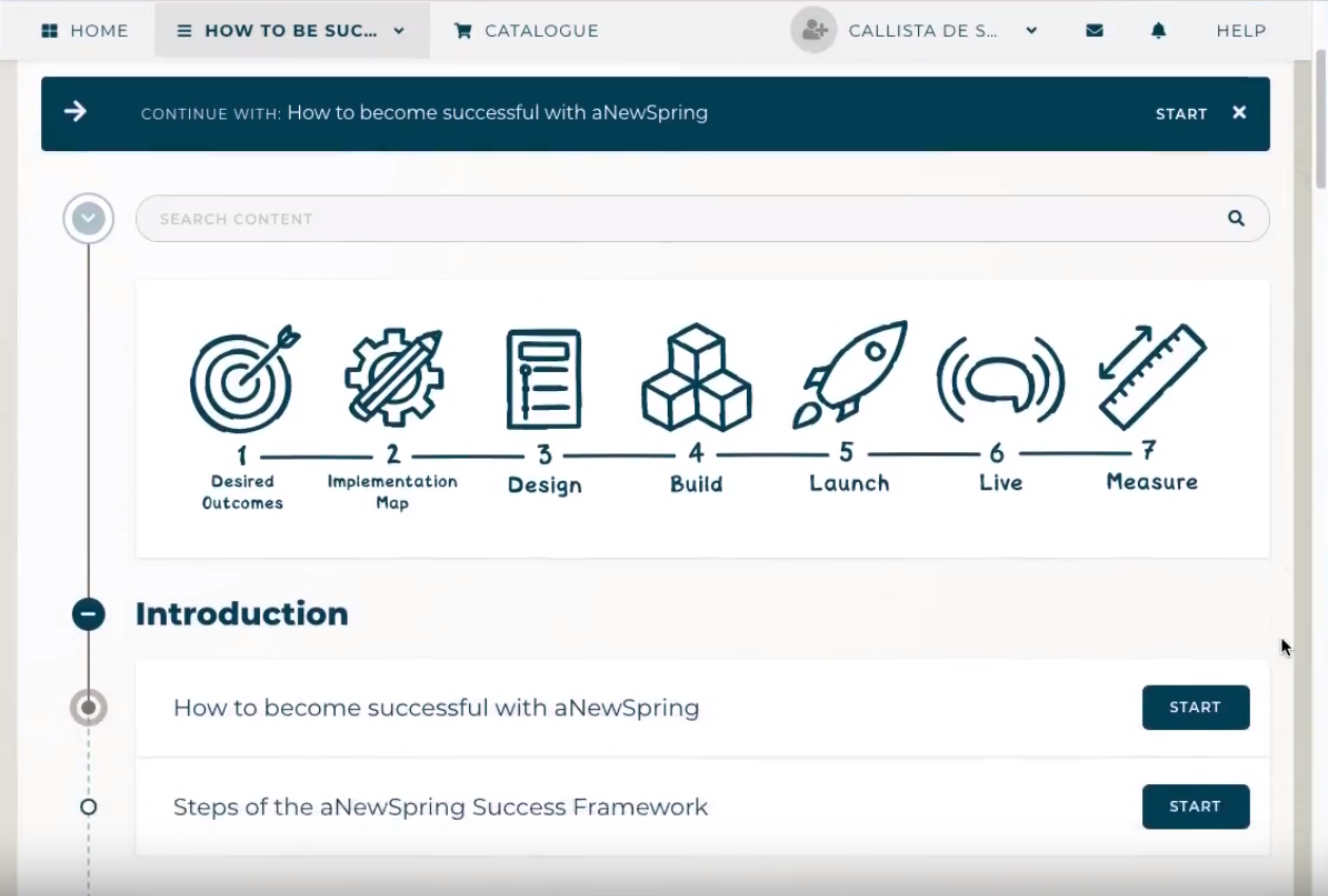 Deshalb haben wir eine Methodik entwickelt: das aNewSpring Success Framework, eine Lernreise, die Ihnen hilft, das Beste aus der Plattform herauszuholen. Während dieser Trainingseinheiten werden Sie ausführlich in die aNewSpring-Umgebung eingeführt. Jeder Schritt in diesem Rahmen wird Sie einer erfolgreichen Implementierung näher bringen."